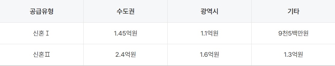 - 임대보증금 : 지원한도액 범위 내에서 전세보증금의 5%(신혼Ⅰ), 20%(신혼Ⅱ)